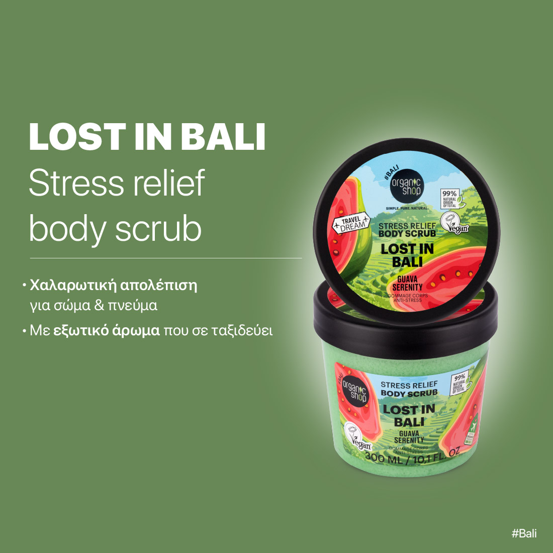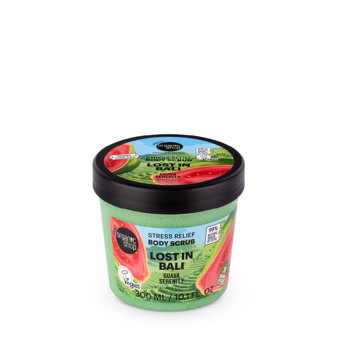 Ανακάλυψε το Scrub σώματος Travel Dream με Γκουάβα, βυθίσου στη μαγεία του Μπαλί και απόλαυσε μια εξωτική εμπειρία περιποίησης που αφήνει την επιδερμίδα απαλή και ενυδατωμένη! Η απολαυστική του σύνθεση με βιολογική γκουάβα απολεπίζει απαλά το δέρμα, αφαιρώντας τα νεκρά κύτταρα και χαρίζοντας φυσική λάμψη και βελούδινη υφή. Το τροπικό του άρωμα ξυπνά τις αισθήσεις και μετατρέπει τη ρουτίνα περιποίησης σε μια στιγμή χαλάρωσης και αναζωογόνησης.