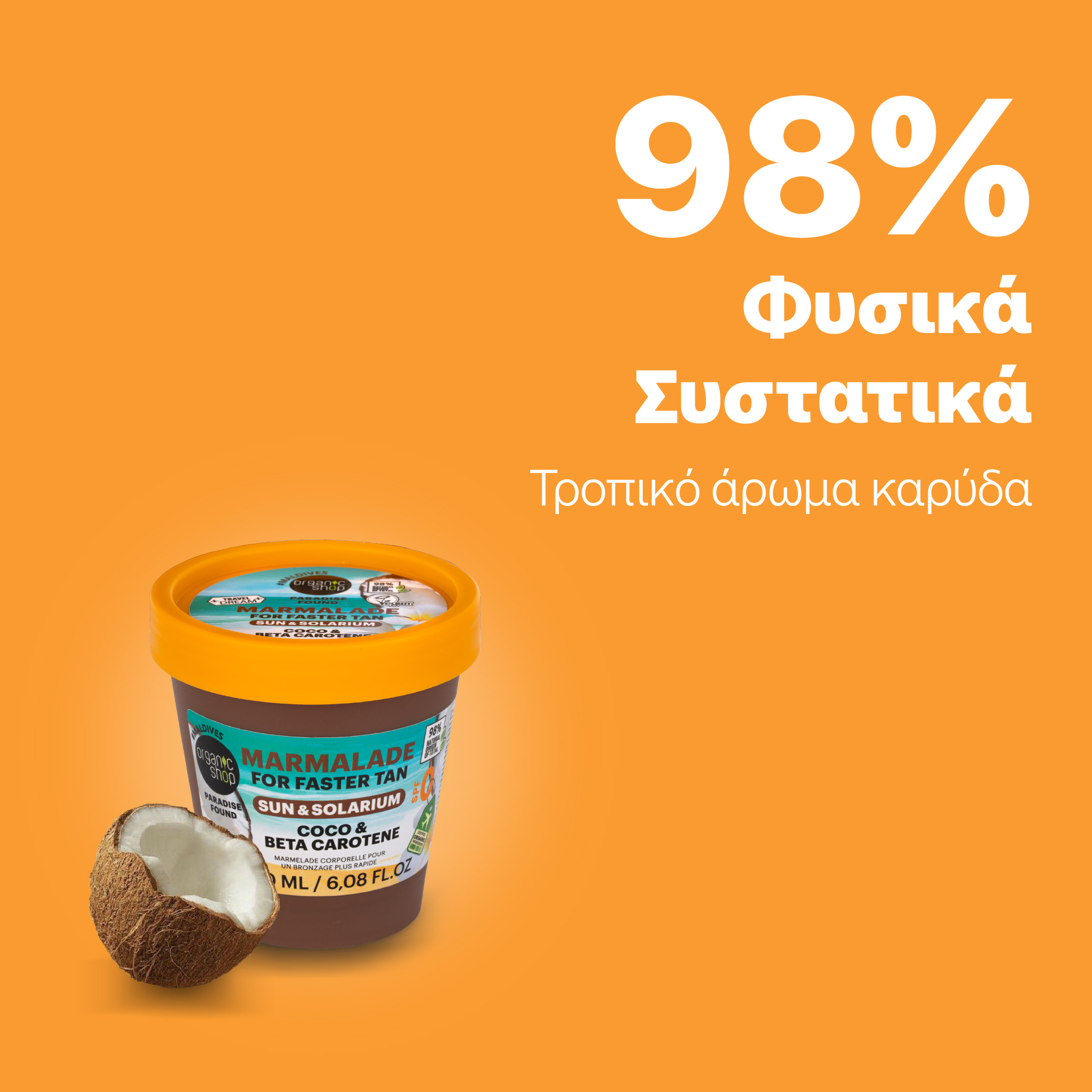 Με τη μοναδική βουτυρένια υφή και το τροπικό άρωμα καρύδας, η tan-boosting μαρμελάδα σώματος απλώνεται εύκολα και απορροφάται γρήγορα, αφήνοντας την επιδερμίδα απαλή και λαμπερή. Η σύνθεσή της έχει σχεδιαστεί για να ενισχύει και να παρατείνει το φυσικό μαύρισμα, είτε κατά την έκθεση στον ήλιο είτε στο solarium.