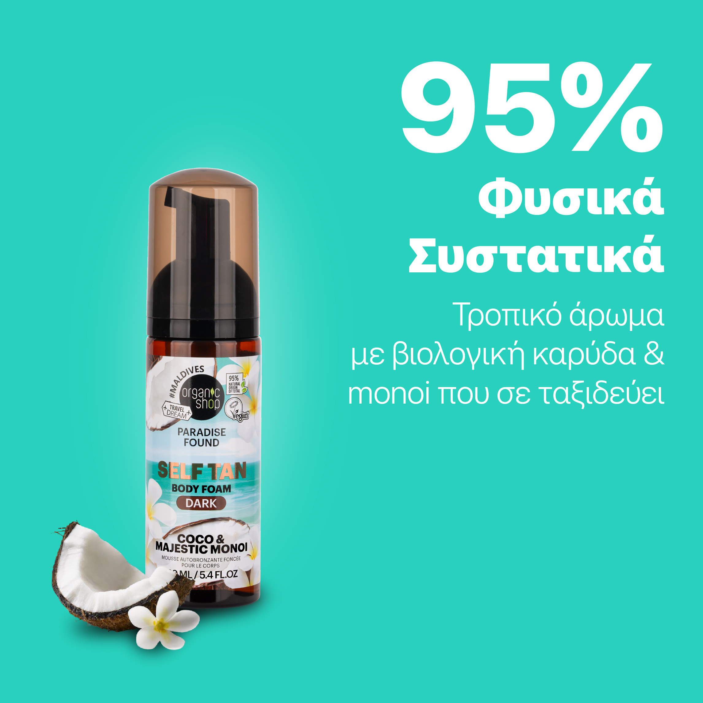 Ανακάλυψε τον Organic Shop Αυτομαυριστικό Αφρό Σώματος Paradise Found Coco & Majestic Monoi Dark 160ml και χάρισε στην επιδερμίδα σου βαθύ, φυσικό μαύρισμα που θυμίζει καλοκαιρινό ήλιο. Αν θέλεις ένα έντονο sun-kissed αποτέλεσμα χωρίς έκθεση στον ήλιο, αυτός ο self tan αφρός σώματος προσφέρει εύκολο και ομοιόμορφο μαύρισμα στο σπίτι, χωρίς τους κινδύνους της UV ακτινοβολίας.